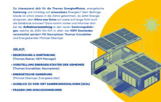 Einladung zum Infoabend: Mit dem Energiekataster zur klimafitten Gemeinde EINTRITT FREI! | WIR BITTEN UM EINE UMWELTFREUNDLICHE ANREISE. KEM-Infoabende in allen 4 KEM Gemeinden zum Thema Energieeffizienz und Gebäudesanierung: [...]