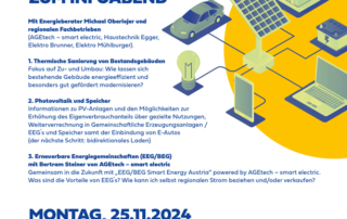 Einladung zum Infoabend: Mit Energieberater Michael Oberlojer & regionalen Fachbetrieben EINTRITT FREI! | WIR BITTEN UM EINE UMWELTFREUNDLICHE ANREISE. MONTAG, 25.11.2024 BEGINN: 19.00 UHR KESSLERSTADEL, KIRCHPLATZ 4, MATREI i.O. [...]