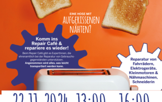 Repair Cafe 22.11.2024, 13:00 - 16:00 Uhr Komm ins Repair Café & repariere es wieder! Defekte Toaster, Hosen mit aufgerissenen Nähten, wacklige Hocker, kaputte Spielsachen,... vieles wandert auf den [...]